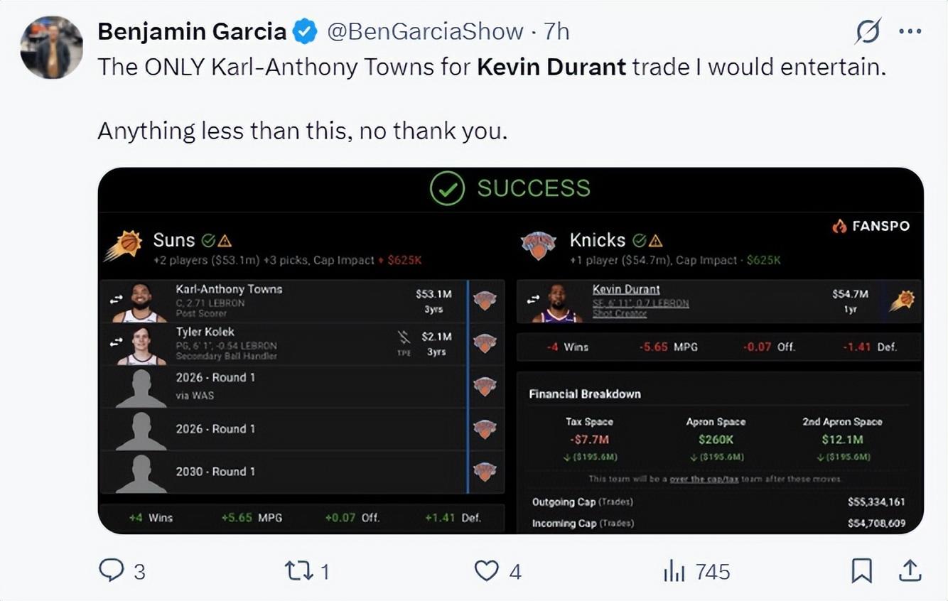在曝出太陽有意唐斯,尼克斯有意杜蘭特後,太陽記者BenJamin Garia就列出一筆交易方案,尼克斯送出唐斯、科勒克、2026年奇才首輪、2026年尼克斯首輪、2030年尼克首輪換杜蘭特。