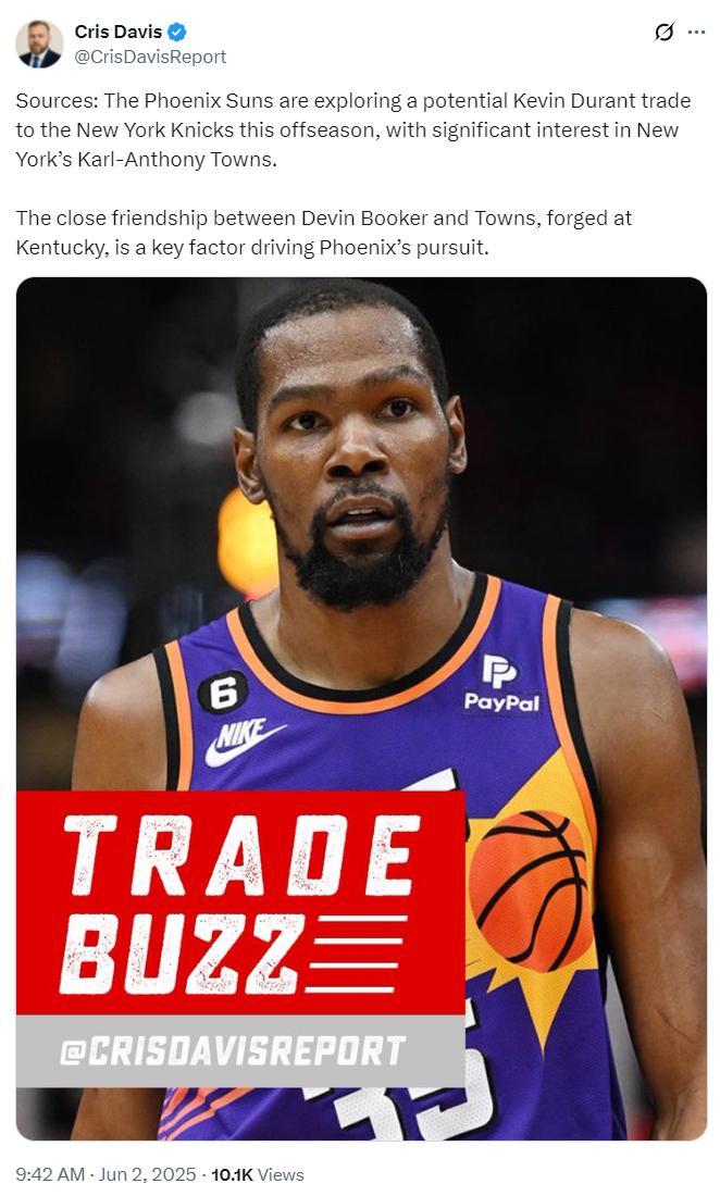 根據紐約記者克里斯-戴維斯的報道,有消息人士透露,菲尼克斯太陽探索休賽期交易杜蘭特到紐約尼克斯的可能性,鳳凰城對紐約的唐斯感興趣,布克與唐斯在肯塔基大學時期結下了深厚的友誼,這是太陽推動交易的關鍵因素。