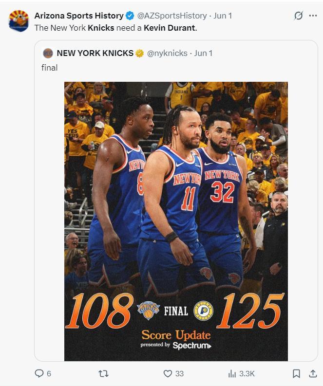 在尼克斯東決折戟後,就有美媒建議尼克斯在休賽期追逐凱文-杜蘭特。