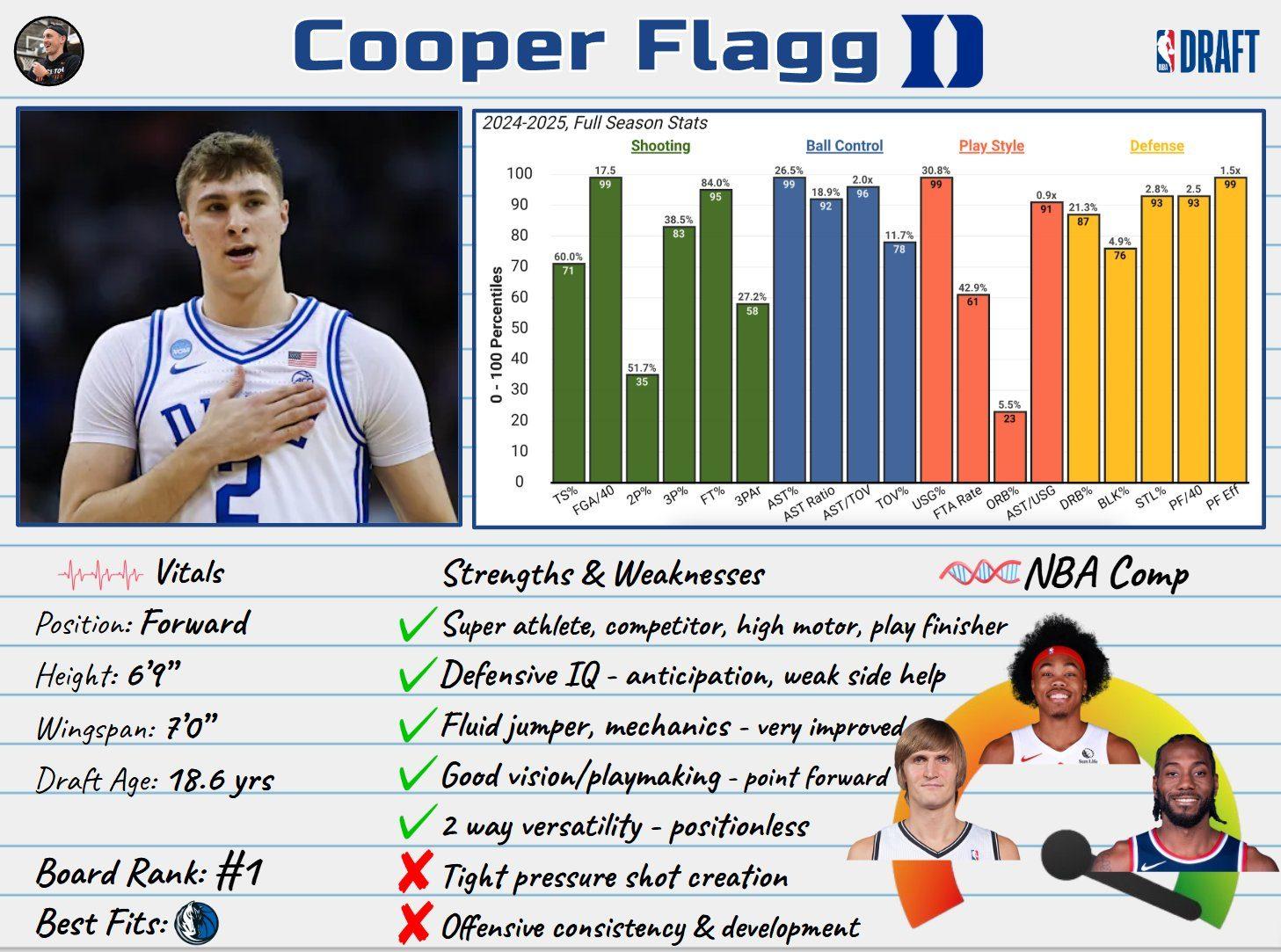 庫珀-弗拉格已經鎖定2025年的狀元秀,獨行俠也一早表明態度願意用狀元籤選中杜克天才弗拉格。弗拉格在這屆選秀中沒有人可以接近,他的模板是基裏連科、倫納德、斯科蒂-巴恩斯。6尺9的身高可以從1打到5。