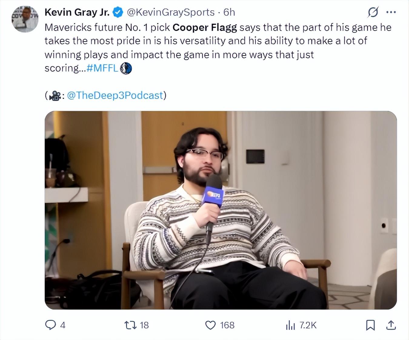 而獨行俠記者凱文-特里則轉推發聲:“獨行俠未來的狀元郎弗拉格表示,他對比賽最引以爲傲的地方是多面性,他可以得分、助攻、保護籃板、護框、發動快攻,他能以多種方式影響比賽,得分只是一個很小的手段。”