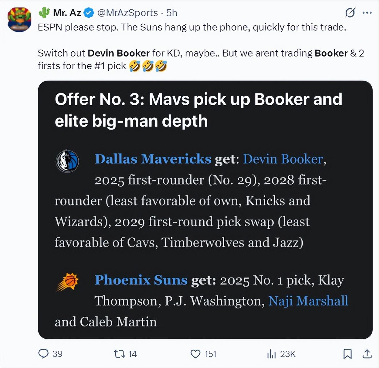 太陽媒體回懟ESPN:求求你們別再說了,太陽掛斷電話吧,趕緊結束這筆討論。我們不願意交易布克,我們只想送走杜蘭特,你們讓我們用布克+2個首輪去換狀元籤,我們不可能願意。