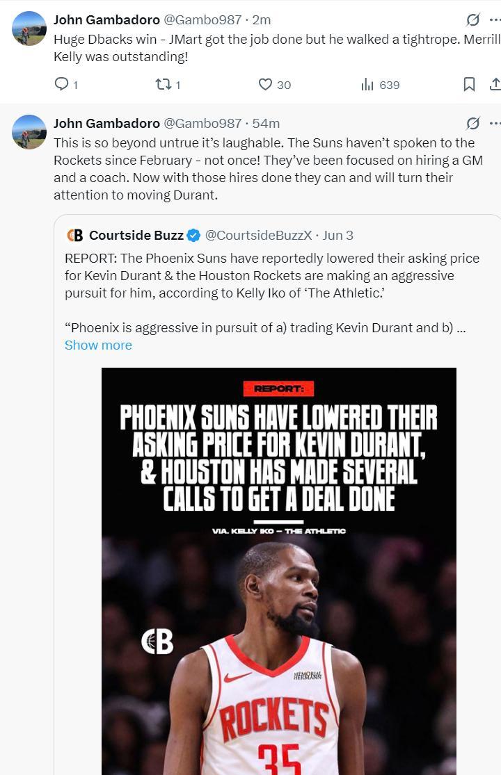北京時間6月5日,太陽記者John Gambadoro轉發了凱利-伊科的推文回覆:“這完全是無稽之談,真是令人發笑。太陽隊自從二月份以來就一次都沒有和火箭有過交流!他們這段時間一直專注於聘請總經理和主教練。現在這兩項工作已經完成,他們確實會把注意力轉向交易杜蘭特。”