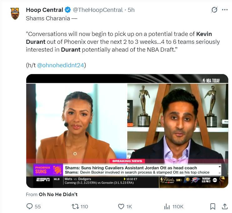早些時候ESPN名記Shams在播客節目中談到杜蘭特的交易流言:接下來的2-3周裏,有關於凱文-杜蘭特的交易流言會更多,在NBA選秀夜之前,我預計至少有4-6支球隊會對KD產生濃厚的興趣。