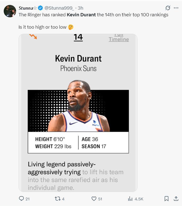 本賽季場均36.6分鐘,拿到26.6分6籃板4.2助攻0.81搶斷1.24蓋帽,命中率52.7%,三分命中率43%的杜蘭特被評選爲聯盟第14的巨星,即將年滿37歲的KD就快不是聯盟前15的超巨了。
