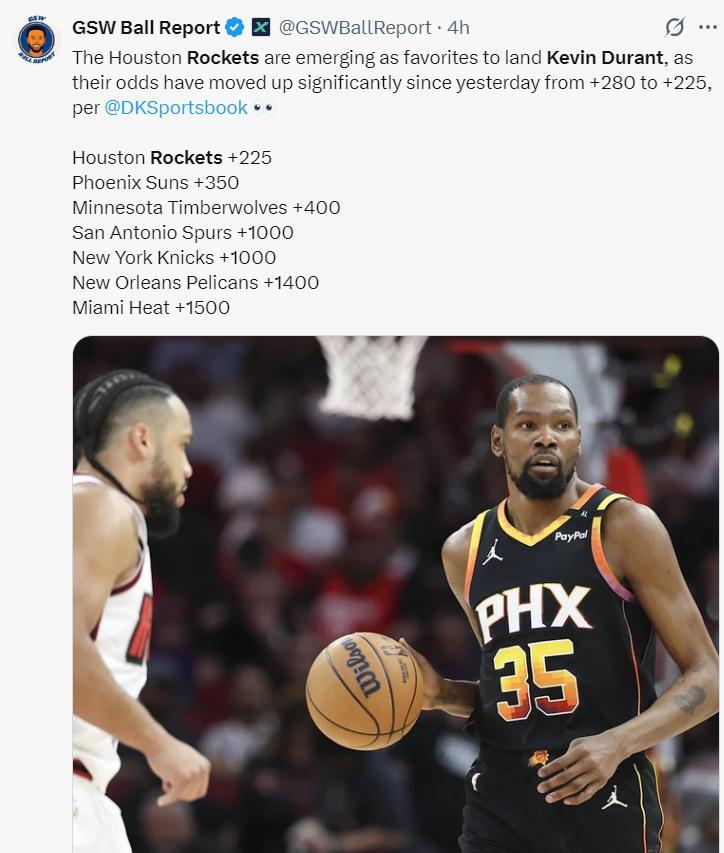 幾乎是同一時間DSK更新了 杜蘭特下家的賠率:火箭+225第一,太陽+350第二,森林狼+400第三,馬刺+1000第五,尼克斯+1000第五,鵜鶘+1400第六,熱火+1500第七。