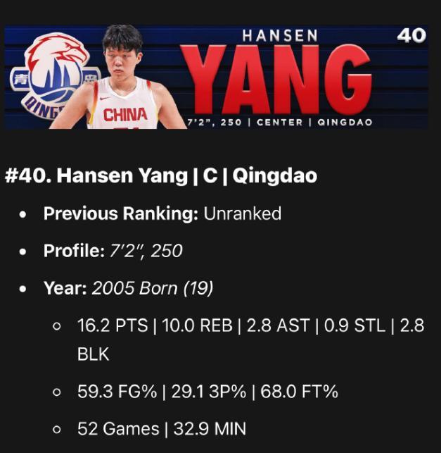 在BR最新的選秀預測中,楊瀚森42順位被公牛選中。