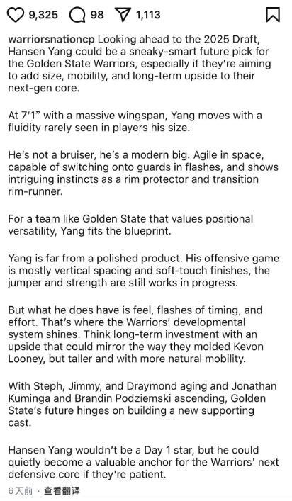 近日,勇士媒體Warriors Nation向球隊舉薦了中國內線楊瀚森,勇媒希望球隊用41號籤選中楊瀚森,勇媒覺得楊瀚森只要有足夠的時間去成長,他會成爲勇士內線的新支柱。