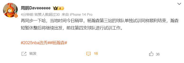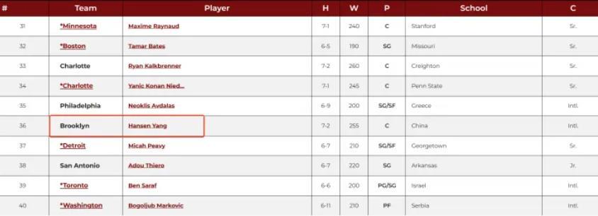 在最新的一期的NBADraft模擬中,楊瀚森在第36順位被籃網選中,同期下滑一位。