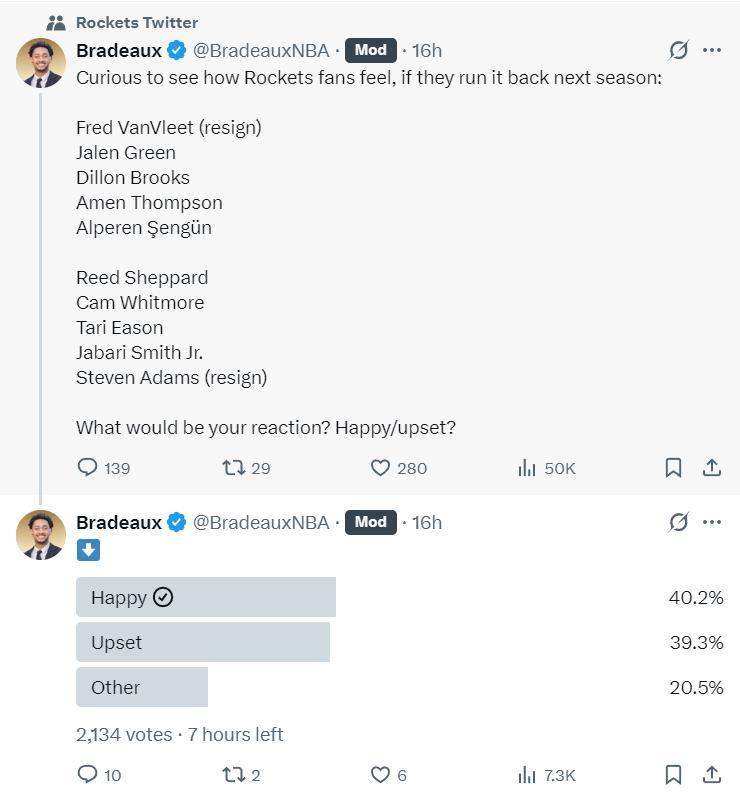北京時間6月5日,休媒Bradeaux詢問火蜜們:假如球隊下賽季的主要輪換陣容是這樣你們願意嗎?(他發起投票)