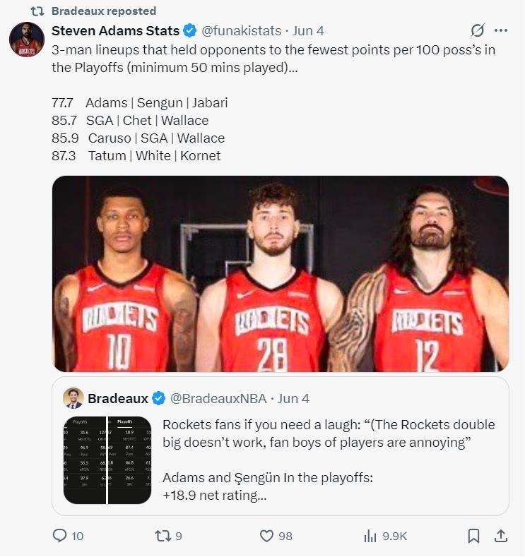 24-25賽季的休斯頓火箭隊是自18-19賽季後首次拿下50+勝場數,只可惜在季後賽他們首輪就折戟沉沙,賽季結束後很多媒體都認爲火箭缺少一位真正意義上的超巨,他們豐厚的年輕資產與選秀權可以完成對超巨的引援。