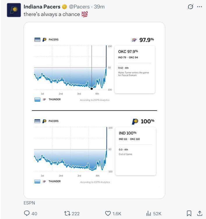 步行者官方還曬出當雷霆領先步行者15分時,官網給出雷霆有97.9%的概率贏下G1,但最終步行者完成了逆轉,僅用2.1%的概率完成了超級逆轉。