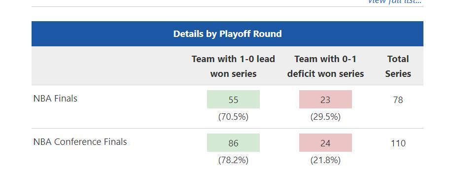 根據NBA統計,總決賽1-0的球隊贏下總冠軍的概率是70.5%,55隊拿下總冠軍,23隊逆轉拿下總冠軍(29.5%)。
