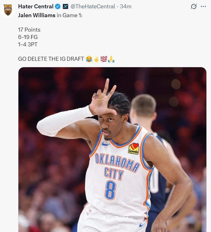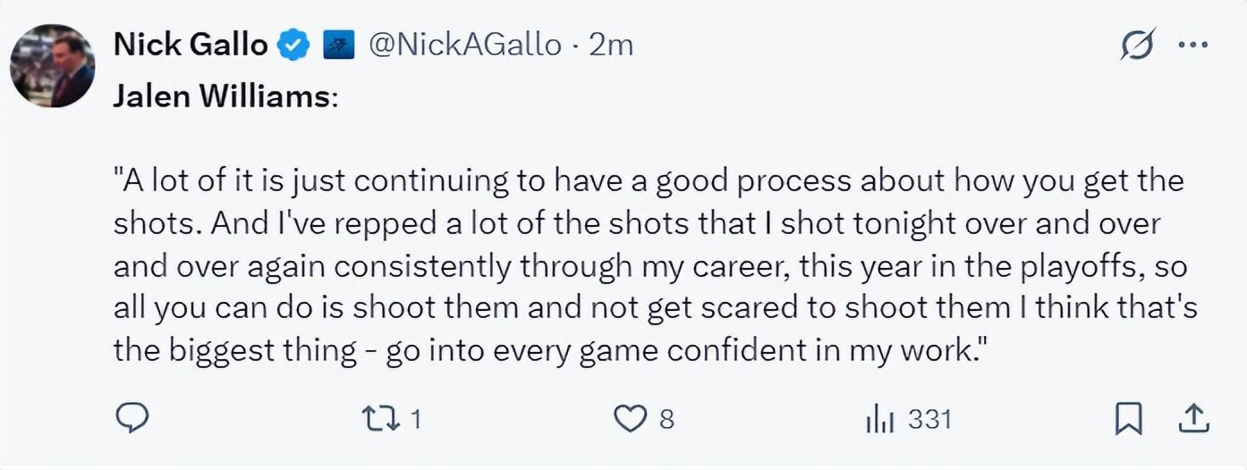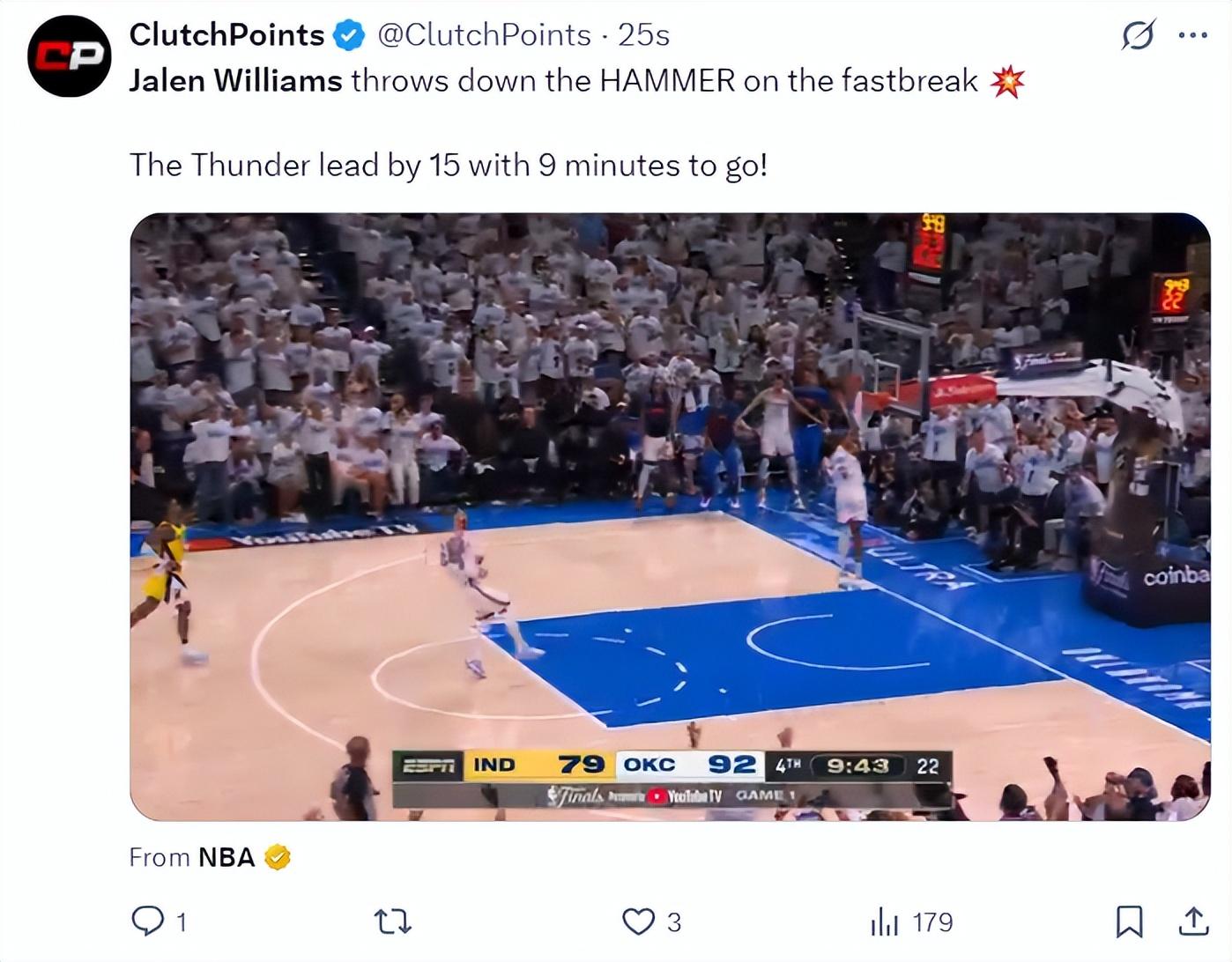 終場前2分16秒傑威的三分球落空,終場前24秒他的中距離也落空,這兩球直接導致的是內姆布哈德三分縮小到3分,西卡前場籃板補籃縮小到1分,SGA後仰不中,哈利伯頓0.3秒準絕殺。換言之傑威全場比賽只打末節前3分鐘的好球。