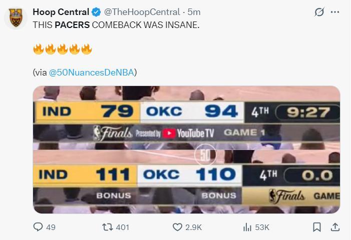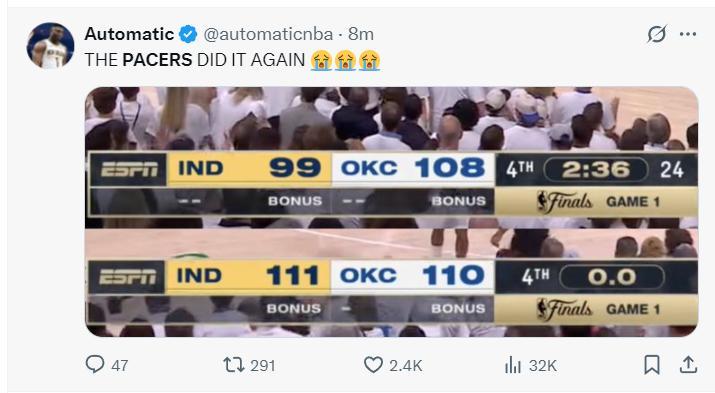 這場比賽後步行者逆轉雷霆登上了全美第一熱搜。