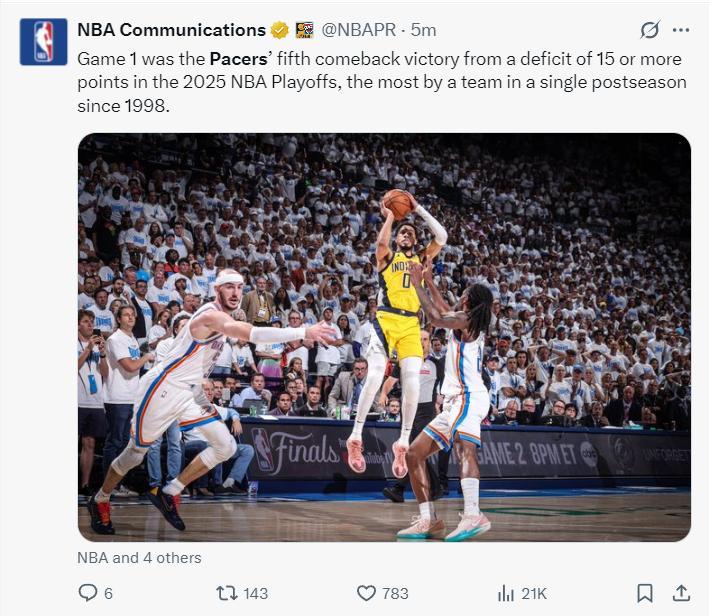 NBA官方寫道:這是NBA歷史第五次總決賽至少落後15分逆轉的案例,也是自1998年後總決賽G1逆轉最多的案例。