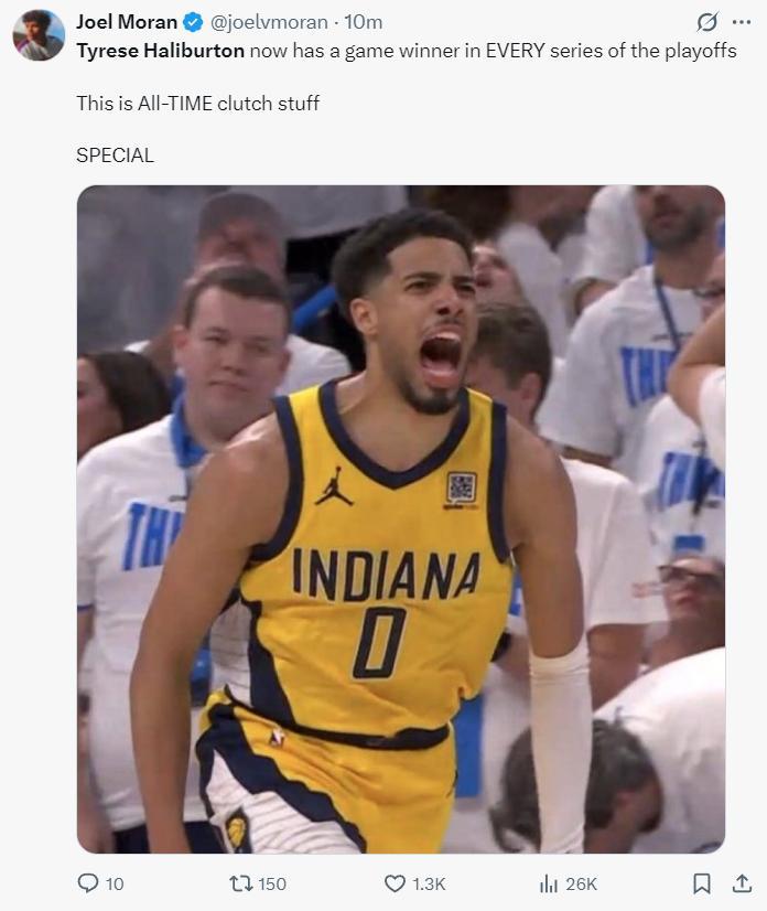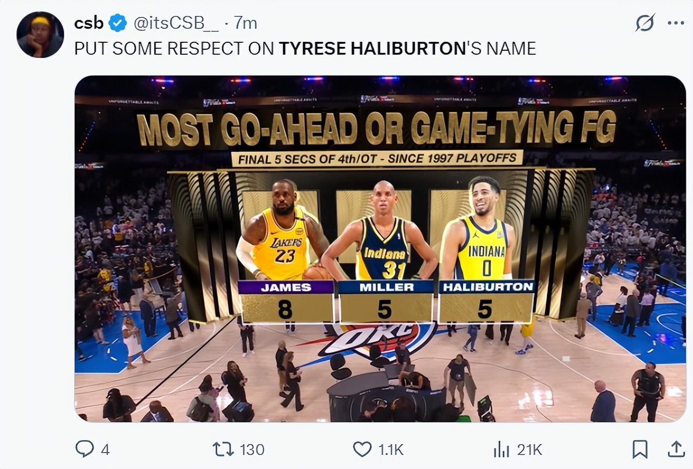 美記:哈利伯頓在每一輪系列賽都至少有一個制勝球,自1997年以來,最後5秒絕平/絕殺,哈利伯頓5次追平米勒,詹姆斯8次第一。