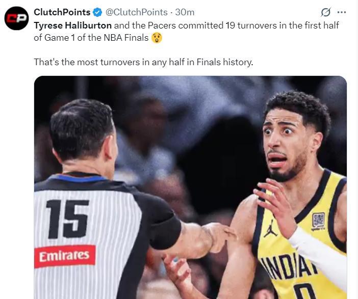 美媒:哈利伯頓帶領的步行者上半場出現了19次失誤,這是NBA總決賽上半場失誤最多紀錄。