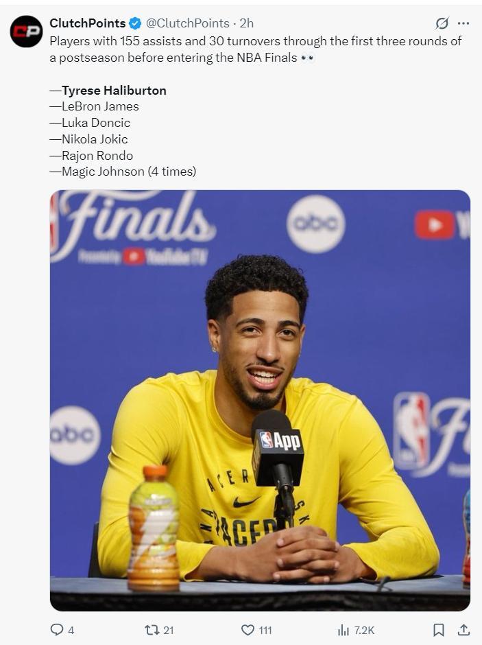 賽前美媒還在爲哈利伯頓打Call,總決賽之前的三輪系列賽155助攻+30失誤的球員只有詹姆斯、東契奇、哈利伯頓、約基奇、隆多、魔術師,可進入總決賽G1後哈利伯頓的失誤就來了。