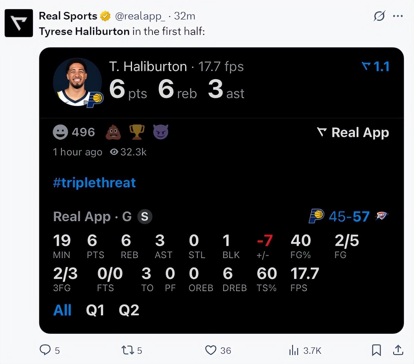 整個上半場哈利伯頓19分鐘,5中2+三分3中2,拿到6分6籃板3助攻1蓋帽3失誤,三次失誤都是在第二節,被多爾特連續的生斷,助攻失誤比1:1極差。