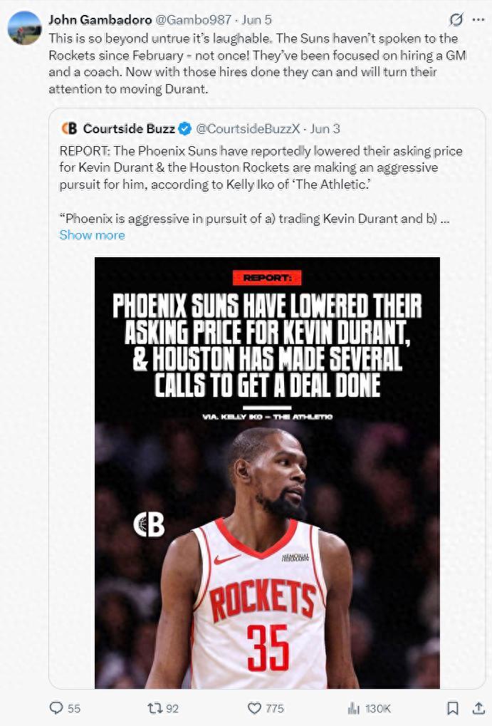太陽隊記John Gambadoro在6月5日回懟了TA火箭記者凱利-伊科爆料太陽多次致電火箭降低杜蘭特要價的言論。他表示:“無稽之談,令人發笑,進入休賽期開始太陽管理層的運作一直是圍繞找尋新的總經理與主教練,除非這兩項工作都完成纔可能着手去詢價杜蘭特。”