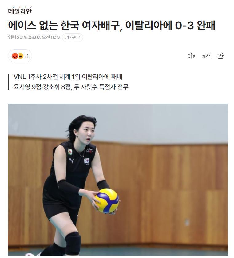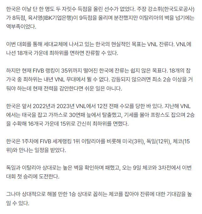 賽後韓國媒體發文《缺乏王牌的韓國女排在世聯賽0-3慘敗意大利已經遭遇二連敗》,文中更是寫道:繼0-3不敵德國後又0-3不敵意大利,這支韓國女排似乎拿下一局都是奢求。