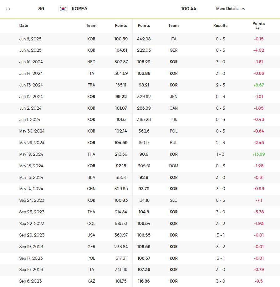 北京時間6月7日,世界女排聯賽,韓國隊0-3不敵意大利隊遭遇二連敗,目前世聯賽墊底三局比分:13-25、13-25、17-25。這場比賽是一邊倒的態勢,第三局意大利已經換全替補了這支韓國女排還只是多拿了4分而已。