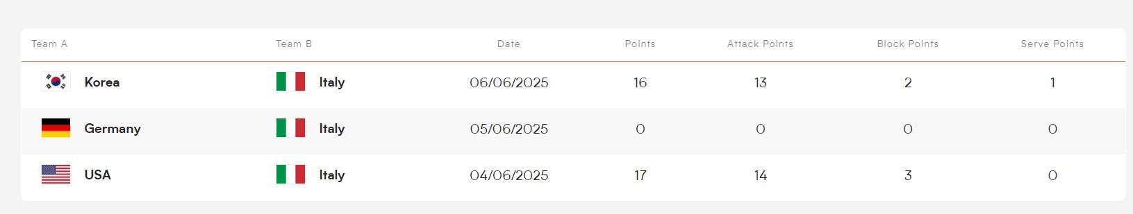 因爲韓國女排的能力太差,意大利女排這邊是多人輪換,所有全隊只有艾格努一人得分上雙,艾格努拿到16分,22扣13中0失誤被攔+2攔1發,扣球成功率59.09%,她打得非常輕鬆。