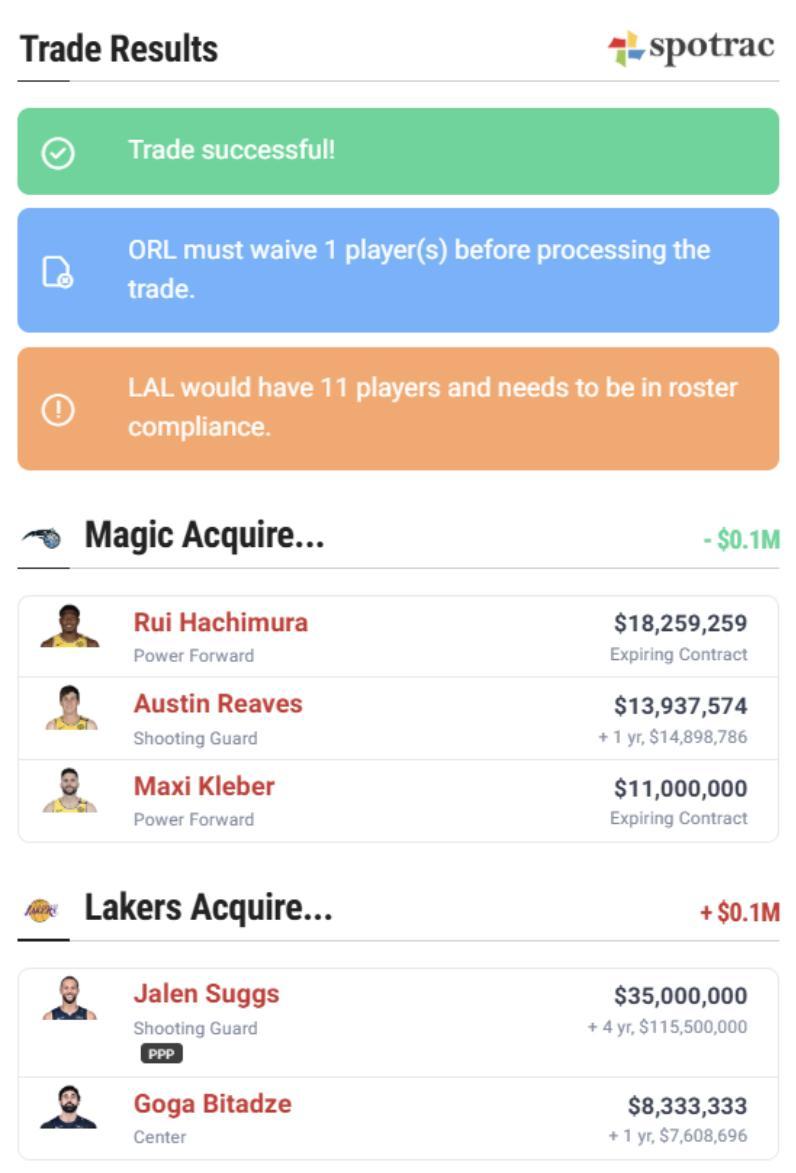 湖人可以用裏夫斯、八村壘、克勒貝爾特送給魔術隊,換來主打防守的薩格斯與比塔澤。防守能力欠缺的湖人隊有了薩格斯與比塔澤的加盟後實力大幅提升。進攻能力不足的魔術得到八村、裏夫斯後實力也顯著增強。