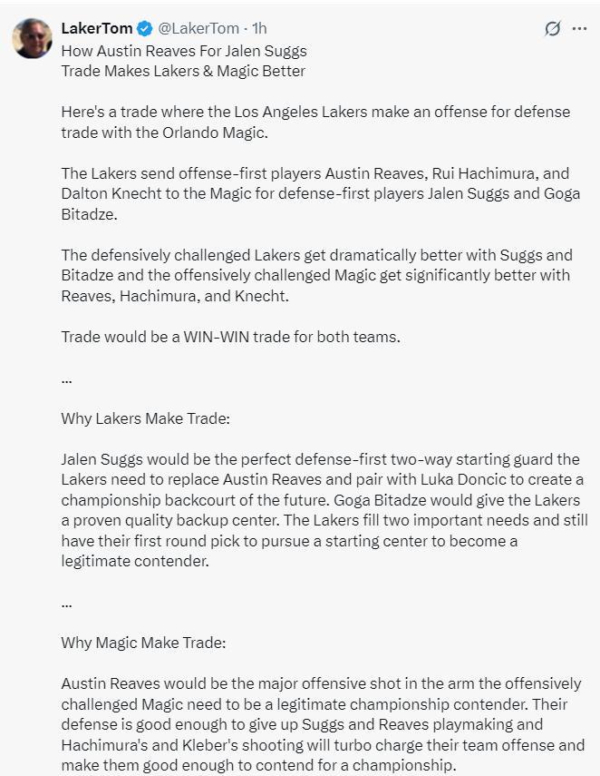 他標題就寫道:奧斯汀-裏夫斯與杰倫-薩格斯互換,這會讓湖人/魔術都變得更強。