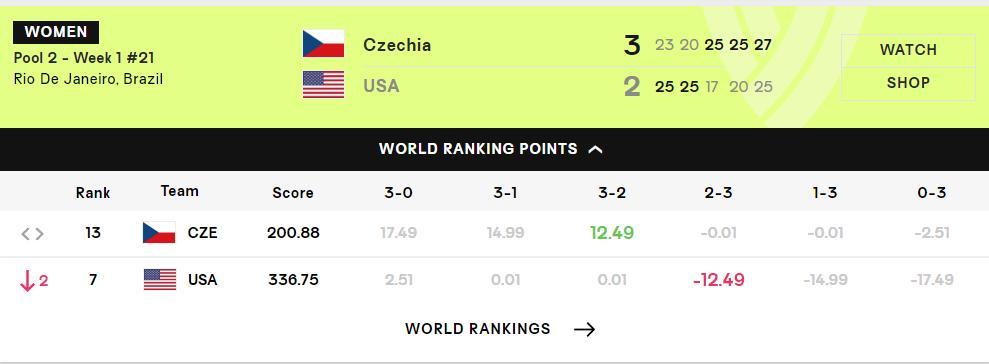 這場比賽捷克女排3-2逆轉美國+12.49分,而美國女排則要-12.49分,對於世界排名第13的捷克是巨大的得分進賬。