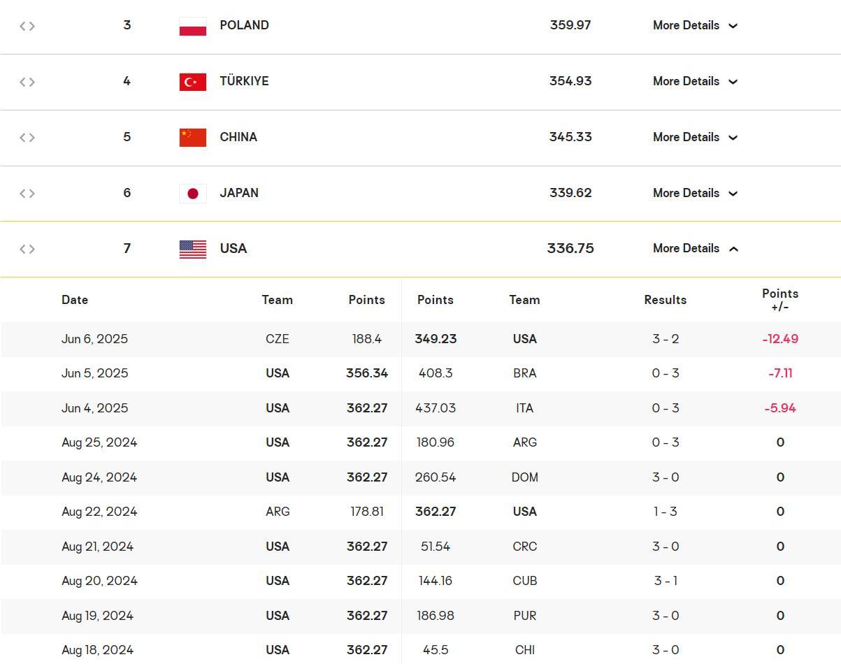 美國女排世聯賽遭遇三連敗,0-3輸意大利-5.94分,0-3輸巴西-7.11分,2-3輸捷克-12.49分,美國女排三場比賽合計-25.54分,從參與世聯賽之前的世界第三直接跌到了世界第七。