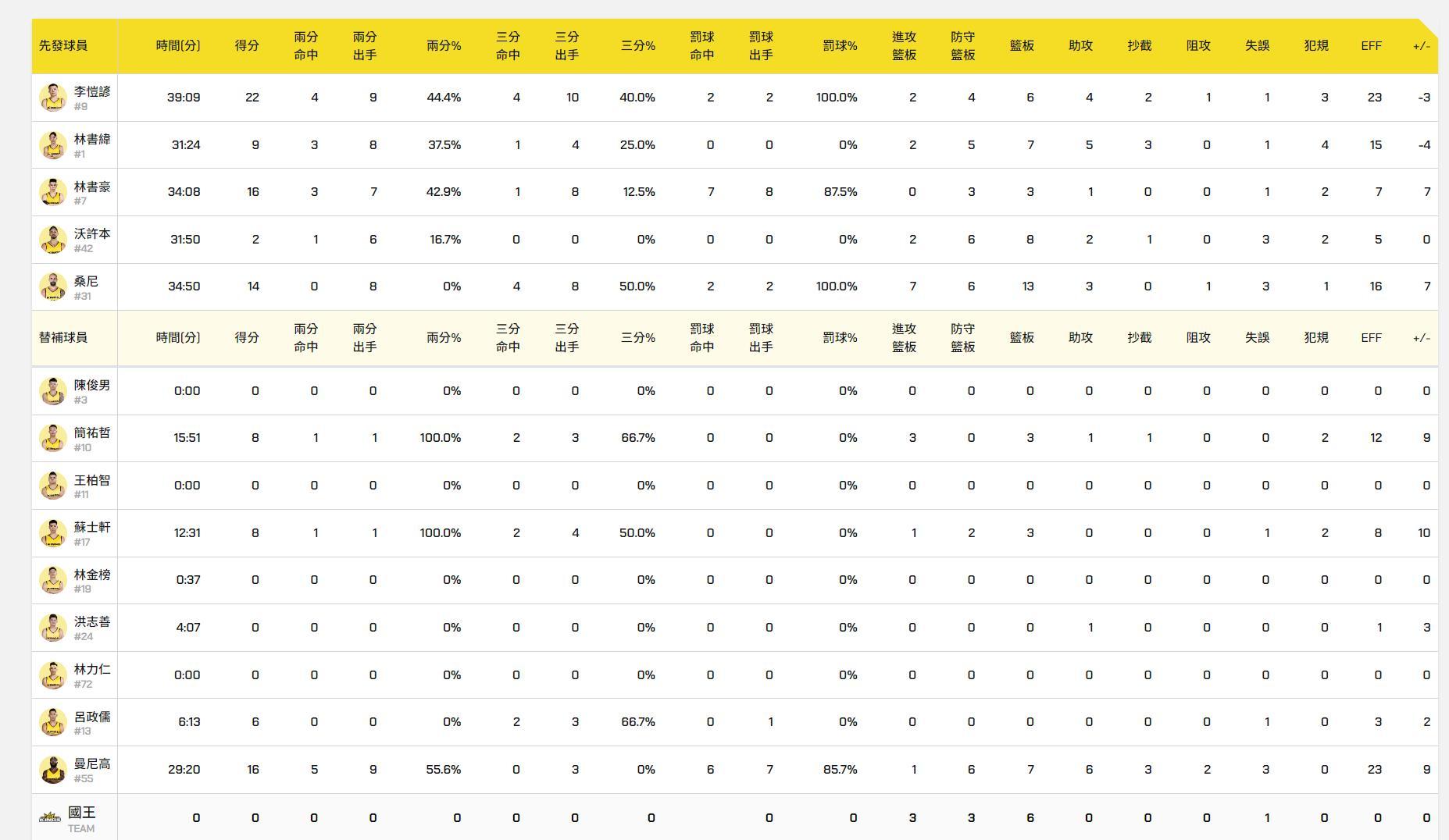 這場比賽新北國王全隊4人上雙,李愷彥19中8,三分10中4拿到22分6籃板4助攻2搶斷1蓋帽;