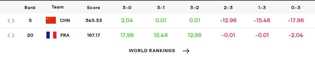 這場比賽中國隊3-0法國隊拿到+2.04分,那麼中國隊就是345.33+2.04=347.37分繼續排在世界第五的位置。