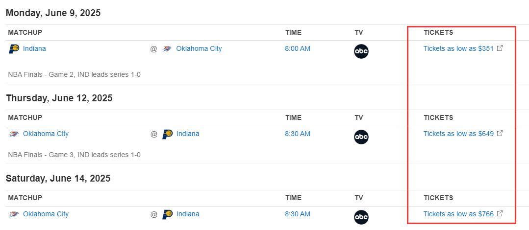 根據票務網站Tickets的售票顯示,雷霆總決賽G2門票只賣351美元,而步行者G3的門票上浮到均價649美元,這比總決賽開打後步行者的主場門票上浮了32%之多。