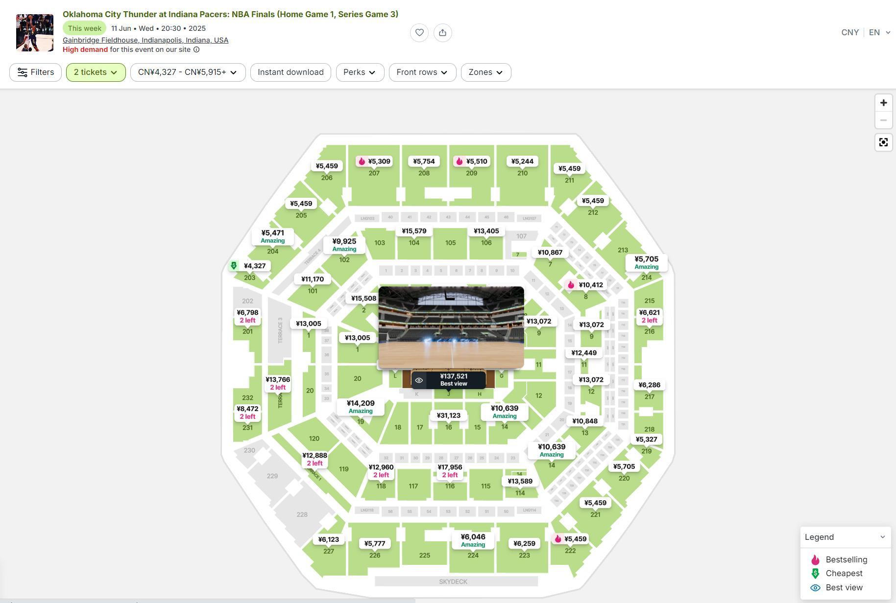 根據全美最知名的黃牛網站顯示,總決賽G3VIP席的票價最高是137521美元一張,沒錯高達13萬美元!就看臺的很多位置也已經炒到了5000美元+(官網買600多的),超過5萬的板塊就有5個,官網賣1000多的位置黃牛都超過了1萬,這一場球步行者將要賺慘!這或許是步行者隊史最高收入的兩場比賽。