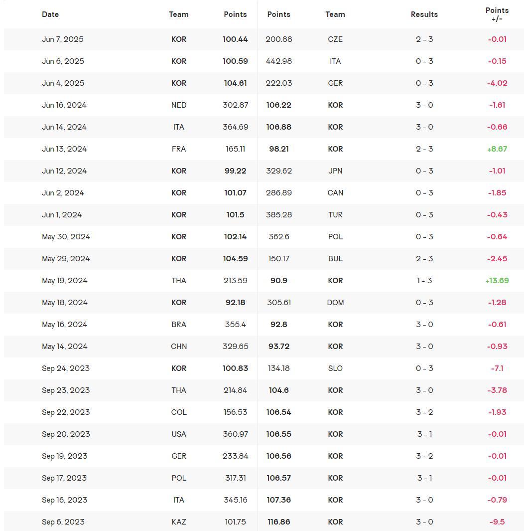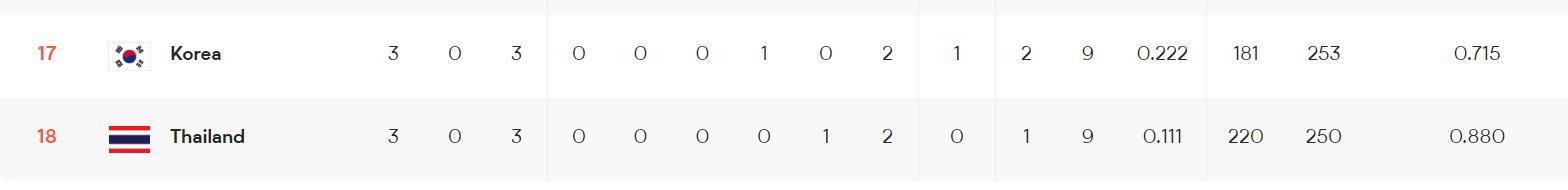 泰國與韓國都是3連敗,不過韓國有一場2-3,泰國是1-3,所以目前墊底的是泰國隊。