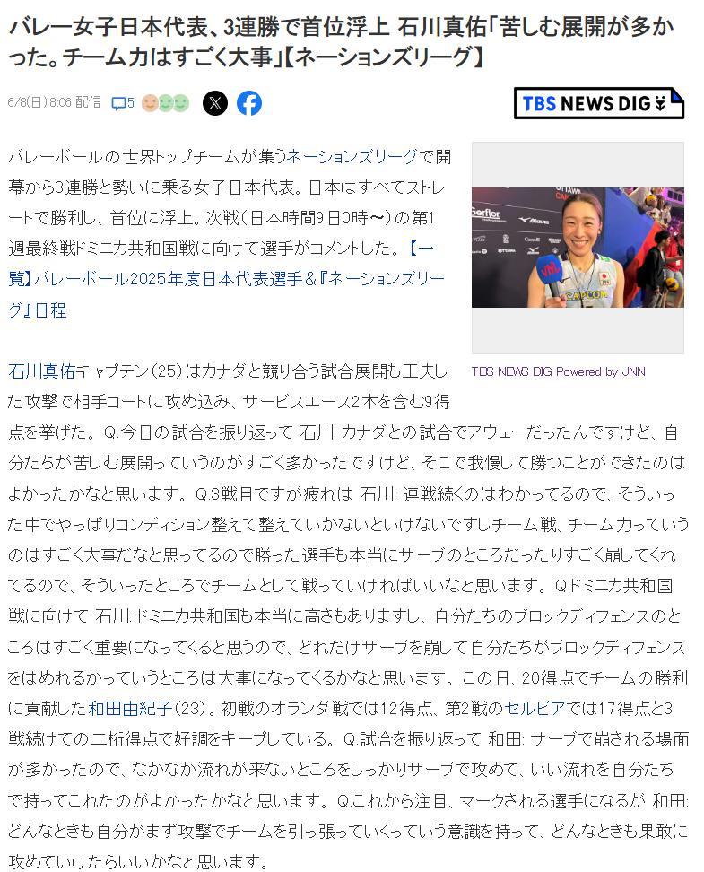隊長石川真佑在擊敗加拿大女排的採訪中說道:“第一局是很痛苦的展開,可我們團結一心,團體的力量很重要,我們堅持打好每一球,進入第二局我們就開始進入狀態,這是一場屬於團體的勝利。”