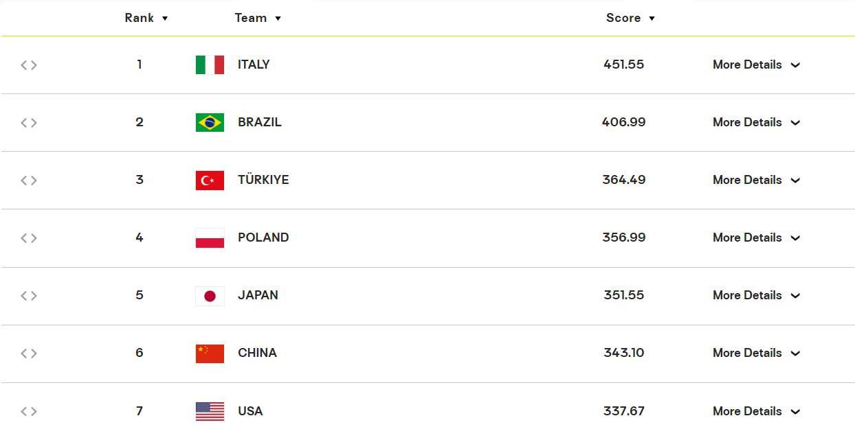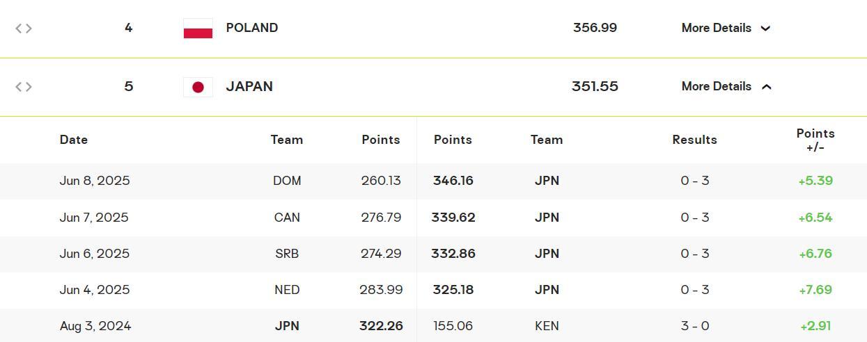 日本擊敗荷蘭+7.69、日本擊敗塞爾維亞+6.76、日本擊敗加拿大+6.54、日本擊敗多米尼加+5.39=26.38分。