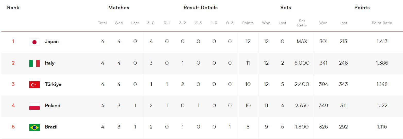 日本女排以全新的陣容參與本屆世聯賽豪取四連勝,而且四場比賽都是3-0,日本女排登頂積分榜首,目前也只有日本、意大利、土耳其三隊沒有輸過球,只有日本是未丟一局。