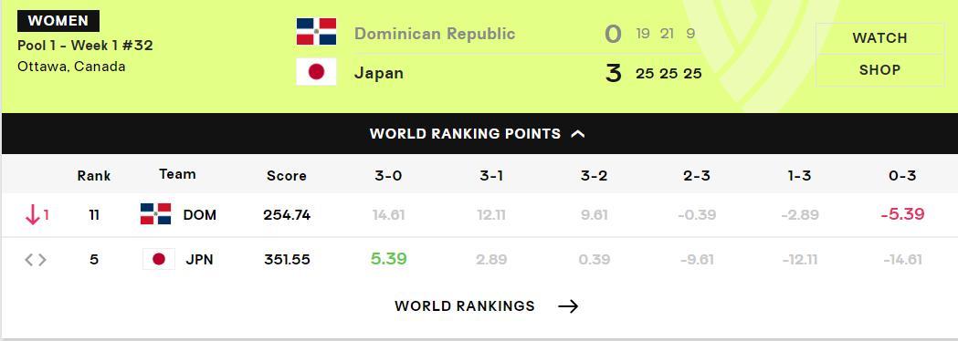 這場比賽日本女排3-0多米尼加 女排,獲得+5.39分,日本女排已經豪取四連勝,日本女排已經升至世界排名第五反超中國女排,中國女排輸給土耳其後已經下滑到世界第六。