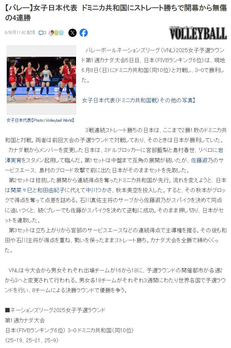 日本媒體6月9日晨發文《日本女排擊敗多米尼加後在世聯賽豪取四連勝 四場比賽未丟一局毫髮無損》。