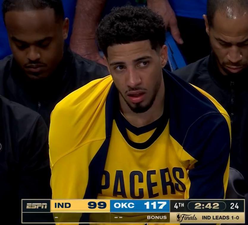北京時間6月9日,總決賽G2,步行者慘敗敵雷霆,大比分1-1被扳平。此役卡萊爾的進攻戰略被戴姆波特完成打破,兩位名帥的博弈算是1勝1負,哈利伯頓這個點前三節被完全冰封,末節大比分落後怒刷12分,比賽還剩4分鐘卡萊爾宣佈投降換下主力,哈利伯頓場下雙眼無神。