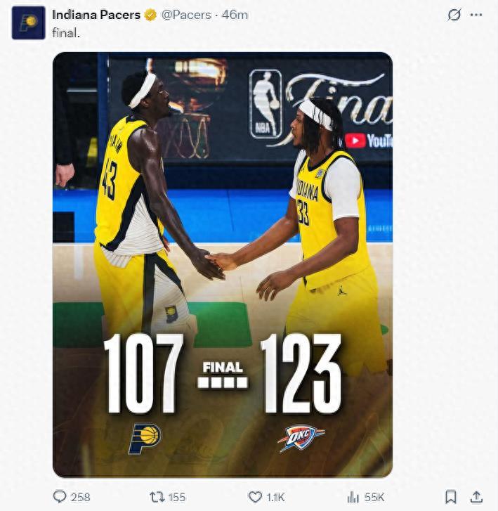北京時間6月9日,總決賽G2,步行者以107-123不敵雷霆,大比分1-1被扳平。G2這場比賽步行者最擅長的三分球被遏制,步行者的外線核心哈利伯頓前三節完全啞火,末節分差已經很大怒刷12分已經爲時已晚,東決MVP西亞卡姆全場11中3也十分拉胯,雙核一同拉胯根本無法贏球。