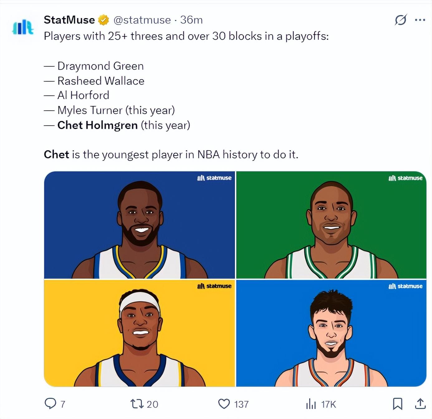 數媒:單詞季後賽三分命中數超過25+且蓋帽數超過30次的球員:追夢、拉希德華萊士、霍福德、特納(今年)、霍姆格倫(今年),切特是NBA最年輕達成這一數據的球員。