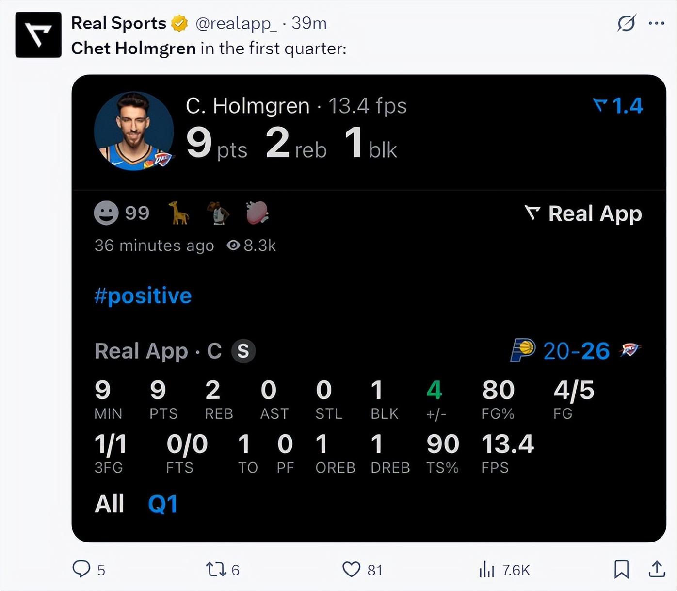 G1霍姆格倫24分鐘9中2拿6分6籃板,他在決勝時刻被戴姆波特給DNP了,這個DNP也是步行者逆轉的X因素,G2戴姆波特決定再度信任切特,首節切特9分鐘裏5中4+三分1中1拿到9分2籃板1蓋帽,真實命中率高達90%。
