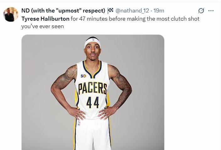賽前NBA官方給出哈利伯頓本賽季最後20秒扳平/絕殺球15中13,關鍵時刻的能力特別強。因爲G1哈利全場比賽實際上也只有14分10籃板6助攻而已。