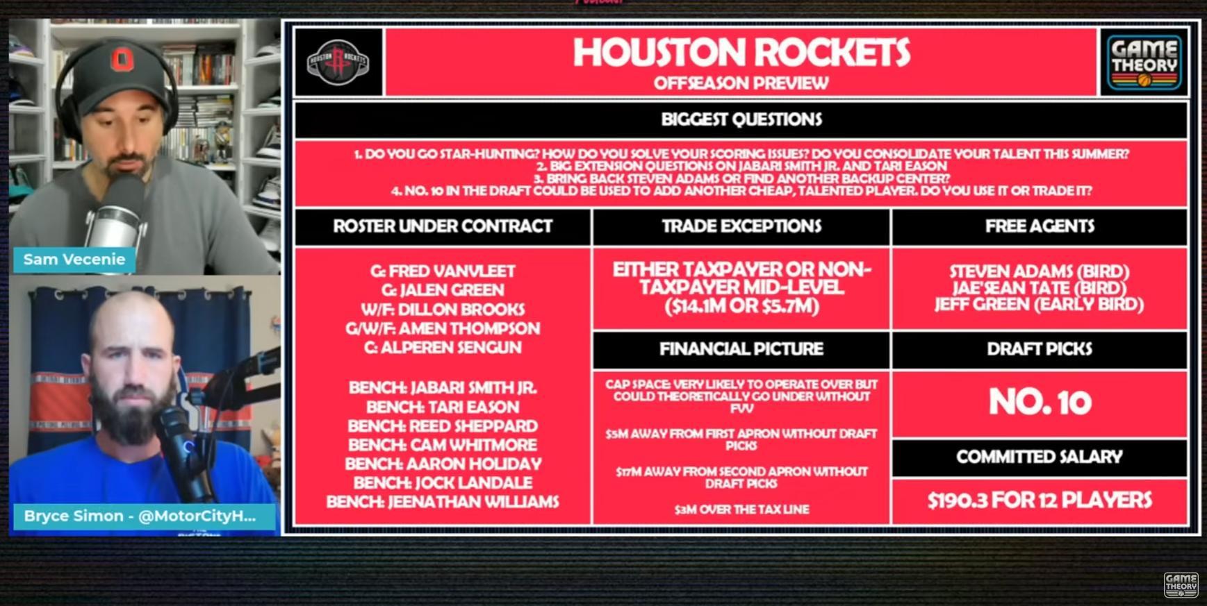北京時間6月8日晚,薪資結構專家Sam Vecenie與NBA記者Bryce Simon在播客節目中談到了潛在休賽期火箭隊的運作,結論是火箭隊最好不要進行交易,將本賽季打到西部第二的陣容帶回來即可,用最低限度的奢侈稅去保留陣容繼續嘗試一個賽季,不用打亂烏度卡的體系。