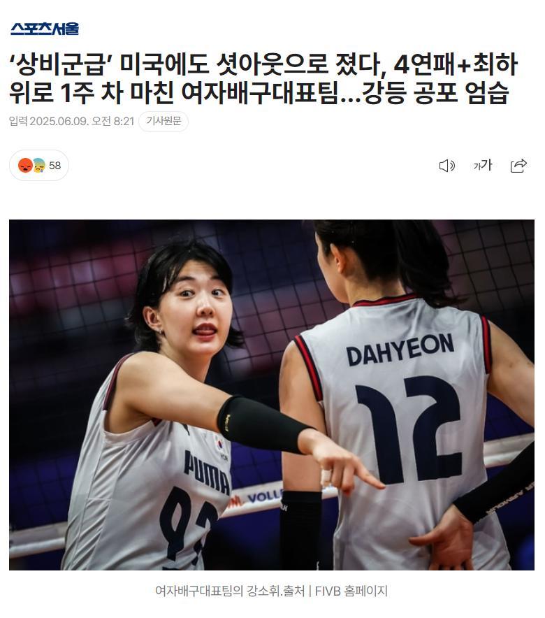 韓媒對這支韓國女排也已經絕望,韓媒發文《韓國女排進入降級危機,她們在首周遭遇4連敗泥沼》,文中寫道這支韓國隊首戰唯一的勝機是對陣捷克隊,結果在1-0領先與2-1領先的情況下被逆轉,韓國失去了拿下本次世聯賽第一勝的最佳時機,韓女排曾在2022年與2023年都遭遇12連敗的慘烈局面,去年艱難拿下2勝,今年首站四連敗後陷入降級危機。