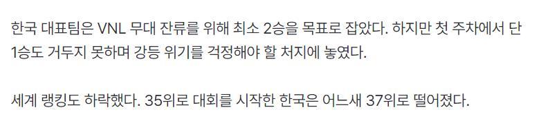 文中寫道:韓國女排在本屆世聯賽是以2勝爲目標,至少要拿到兩勝才能擺脫墊底的命運,可首周她們就未能完成任務,這球隊已經陷入降級危機,世界排名也跌至第37位。